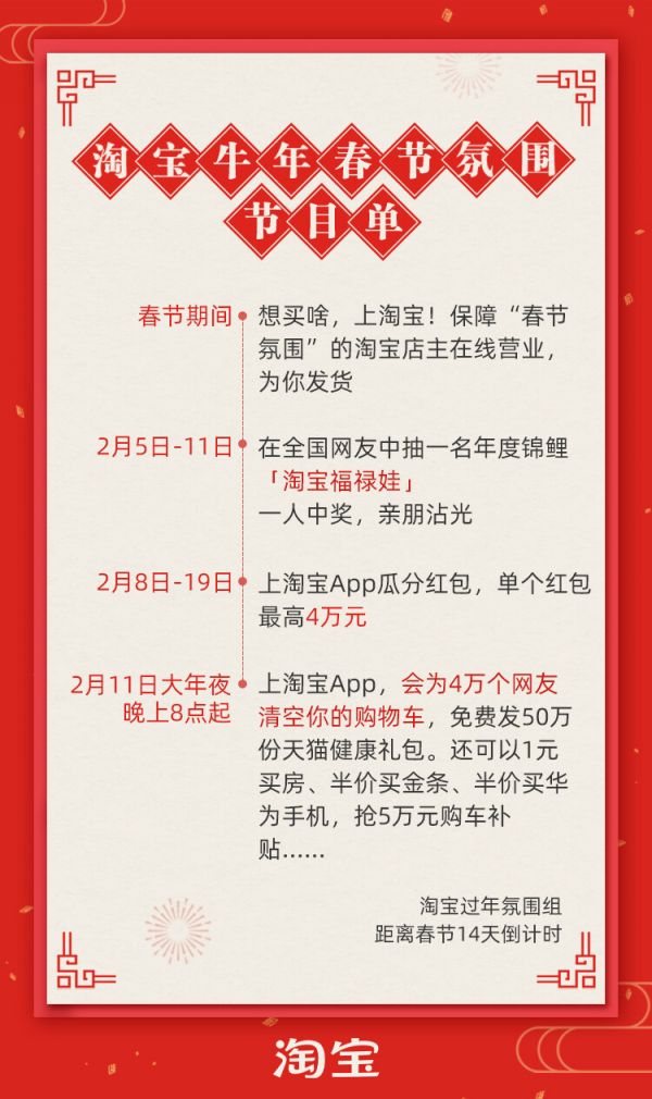 5日,淘寶宣布與2018年中央電視臺《春節(jié)聯(lián)歡晚會》達(dá)成獨(dú)家互動合作,在春節(jié)期間,將發(fā)放總額超過10個(gè)億的現(xiàn)金紅包,其中,除夕夜當(dāng)天,更將推出6億春晚紅包及獎品在央視春晚播放期間回饋收視觀眾。