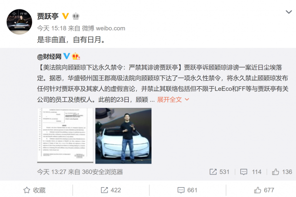 今年,10月23日,顧穎瓊在其微信公眾號(hào)發(fā)布道歉信,表示之前發(fā)表的賈躍亭或其公司正在接受美國(guó)政府調(diào)查,賈躍亭曾將公司財(cái)產(chǎn)通過(guò)信托形式轉(zhuǎn)移給家人等為虛假言論,并向賈躍亭公開(kāi)道歉。