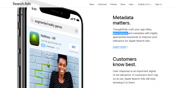 這些詞不僅關(guān)系到app的ASO覆蓋詞,而且同時(shí)蘋果官方網(wǎng)站上明確指出了選擇合適的關(guān)鍵詞,精心構(gòu)思App名稱、說明和元數(shù)據(jù),也可以提高 Apple Search Ads 的相關(guān)性。