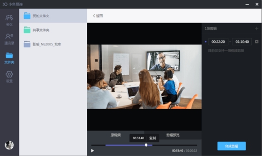 除此之外,這次升級(jí)還增加了客戶端錄制視頻在線剪輯功能,個(gè)人云會(huì)議室的用戶,可以對(duì)錄制的視頻進(jìn)行簡(jiǎn)單的剪輯,將錄制的視頻頭、尾部分的無(wú)效場(chǎng)景刪除掉。