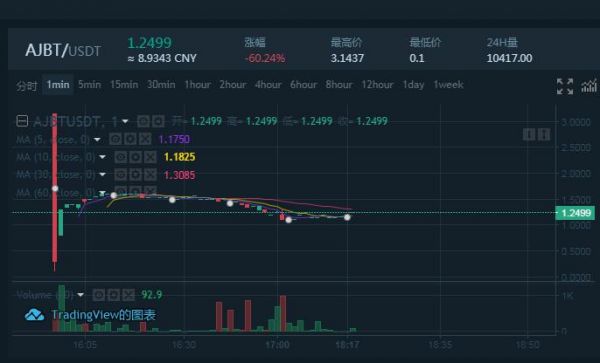 官方數(shù)據(jù)顯示,本次AJBT通證發(fā)行總量32,000個,發(fā)行價1 AJBT=0.1 USDT,用戶使用1,600個AJBT便可兌換一雙Air Jordan 1 Retro High Satin Black Toe球鞋(簡稱AJ紅絲綢黑腳趾),AJBT開盤后最高漲至3.14USDT,較發(fā)行價上漲約30倍,截止發(fā)稿前AJBT報1.249USDT,漲幅1249%。