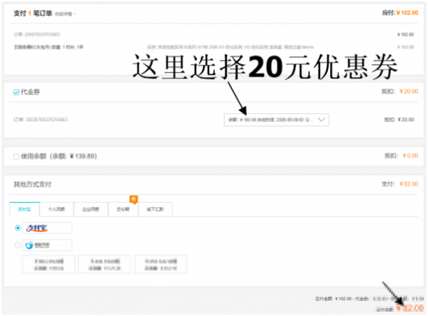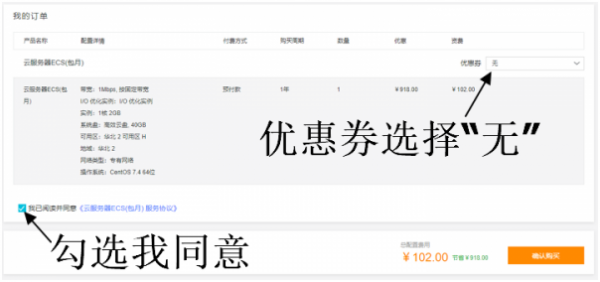 如果你在配置確認頁面看見如下圖片中的優(yōu)惠券了,請選擇“無”,這里的優(yōu)惠券非第一步中領(lǐng)到的券。