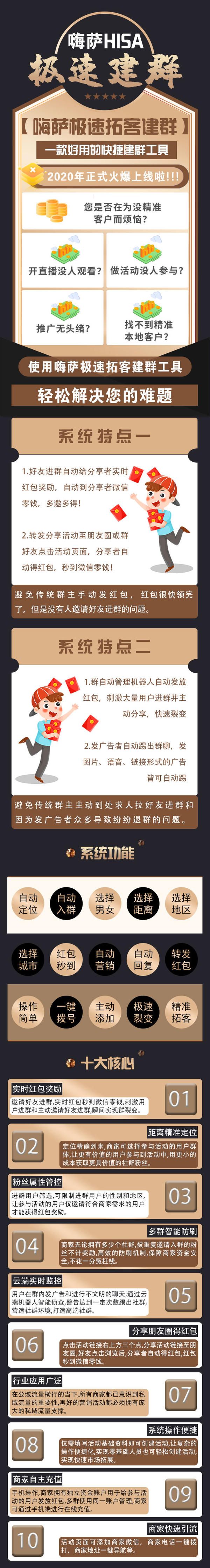 1.快速建群:商家創(chuàng)建活動(dòng)、充值紅包,商家將機(jī)器人拉到原有群或新建群,群內(nèi)好友邀請(qǐng)好友進(jìn)群,自動(dòng)得紅包,秒到微信零錢(qián),一小時(shí)快速創(chuàng)建商家本地精準(zhǔn)500人微信群。