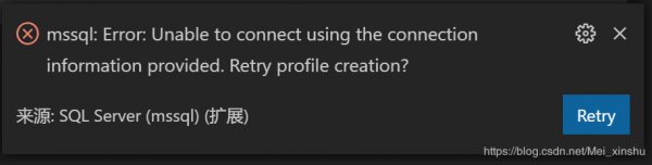 這里我開始因為理解錯了數(shù)據(jù)庫名稱填錯了,遇到了如下的錯誤。(mssql: Error: Unable to connect using the connection information provided. Retry profile creation?),我在博客上看到有和我遇到一樣問題的,把錯誤提示發(fā)出來,方便檢索。只要檢查每一步的信息無誤就不會報這個錯誤了。