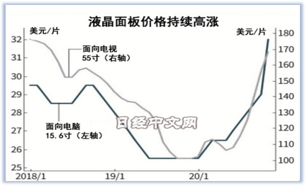 根據(jù)研究機構(gòu)Omdia的數(shù)據(jù)顯示,電視領(lǐng)域最重要的部件顯示面板從2020年6月開始就出現(xiàn)供貨短缺以及價格上漲。截至2020年四季度,液晶電視面板的平均售價(ASP)尤其是50英寸以下的液晶電視面板,在連續(xù)5個月上漲后,上升到2017年四季度的最高水平。而來自招商證券研報的數(shù)據(jù)顯示,截至1月21日,32寸液晶電視面板價格為68美元/片,月環(huán)比上漲4.62%;43寸液晶電視面板價格為117美元/片,月環(huán)比上漲2.63%;55寸液晶電視面板價格為182美元/片,月環(huán)比上漲2.82%。