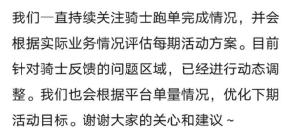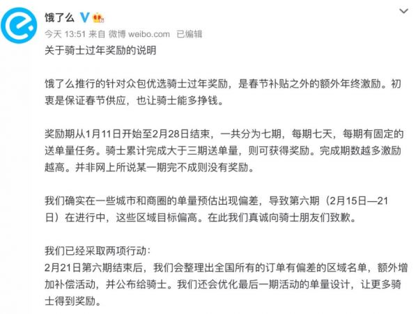 到了下午兩點(diǎn),餓了么終于在官微公開做出說(shuō)明,承認(rèn)在“一些”城市和商圈的單量預(yù)估出現(xiàn)“偏差”,向騎士致歉,并承諾會(huì)讓更多騎士得到獎(jiǎng)勵(lì)。