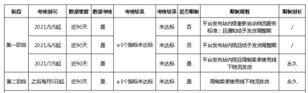 考核節(jié)奏:1)第一個(gè)月考核未達(dá)標(biāo)給予調(diào)整期, 2)第二個(gè)月考核未達(dá)標(biāo)給予過(guò)渡期, 3 )第三個(gè)月考核未達(dá)標(biāo)限制線下物流發(fā)貨。