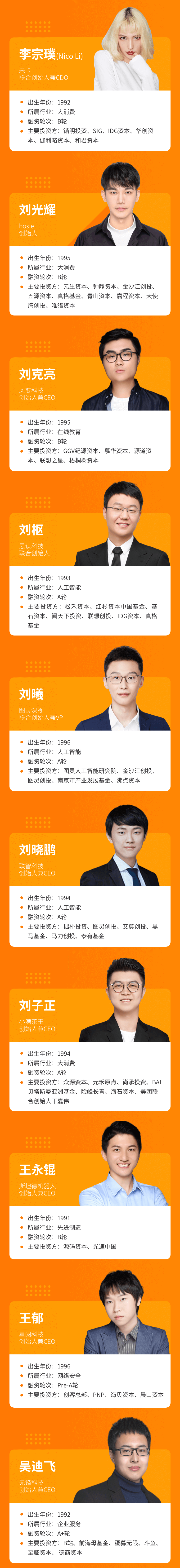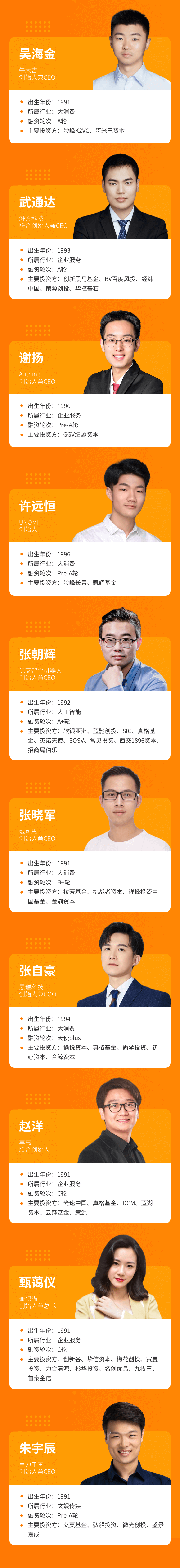 今年“30歲以下創(chuàng)業(yè)新貴”們都是90后,確切來說都是91后。他們平均年齡27.9歲,有18位為首次創(chuàng)業(yè),主要來自于大消費、企業(yè)服務、人工智能等賽道,所創(chuàng)辦的企業(yè)平均“年齡”3.2年,A輪居多,總估值超過130億元。