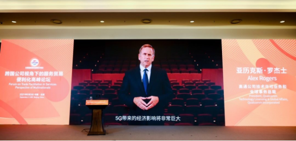 高通公司技術(shù)許可業(yè)務(wù)和全球事務(wù)總裁亞歷克斯·羅杰士(Alex Rogers)在“跨國(guó)公司視角下的服務(wù)貿(mào)易便利化高峰論壇”上發(fā)表視頻演講