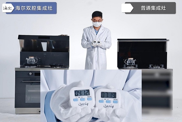 視頻中,海爾雙腔集成灶和普通集成灶同時燒水。為驗證集成灶是否有跑火現(xiàn)象,工作人員將白色紙環(huán)分別放在兩臺集成灶的支鍋架下方,并放上相同容量水壺。打開大火,4分12秒后海爾集成灶的水壺首先沸騰,普通集成灶的水壺在7分19秒沸騰;海爾雙腔集成灶上的紙環(huán)沒有燒灼的痕跡,而普通集成灶上的白色紙環(huán)有明顯被烤黃的痕跡。通過對比發(fā)現(xiàn),海爾集成灶不跑火、熱效率更高,優(yōu)勢明顯。