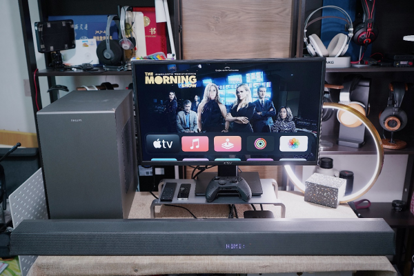 這里我選擇AppleTV 4K作為信號(hào)源,通過HDMI 2.0信號(hào)線接入B8905的HDMI輸入口,并通過另一根HDMI 2.0信號(hào)線從B8905的HDMI eARC輸出口接入4K HDR顯示器,組成一個(gè)完整的電視媒體閉環(huán)。