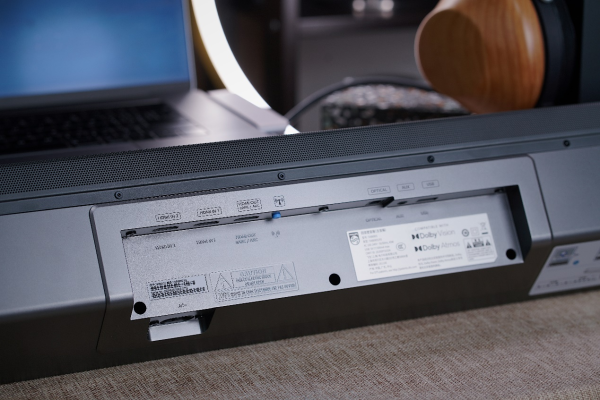 背面隱藏式的接口區(qū)域非常精巧,配置了目前所有主流連接方式:可直接傳輸杜比視界的雙HDMI 2.0 輸入+單HDMI eARC/ARC輸出、光纖輸入、3.5mm AUX模擬輸入、USB外置存儲(chǔ)輸入、WIFI連接的WPS按鈕等物理接口配置齊全。