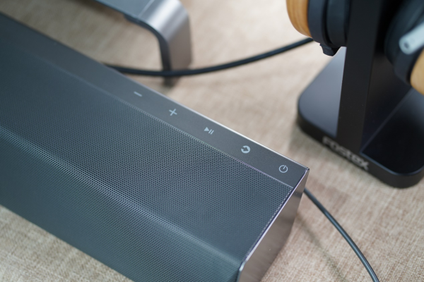 顯示部分由一塊隱藏在正面金屬網(wǎng)罩下的點(diǎn)陣式LED屏幕承擔(dān),對(duì)音箱目前的輸入方式和工作狀態(tài)進(jìn)行指示,顯示效果清晰簡潔,即使坐在遠(yuǎn)處沙發(fā)上也能直觀的進(jìn)行操作。