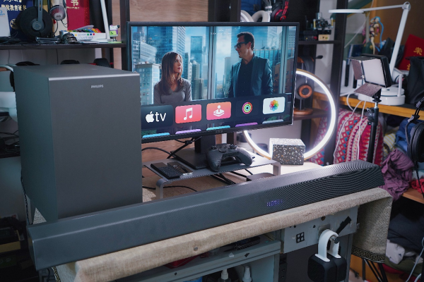 而今天要給大家介紹的,就是來自荷蘭影音巨頭飛利浦的全新一代杜比全景聲回音壁——B8905。它通過全新設(shè)計(jì)的數(shù)字揚(yáng)聲器技術(shù),將傳統(tǒng)杜比全景聲所需的7+1+2單元配置精簡至3+1+2,在不明顯犧牲聲學(xué)表現(xiàn)的前提下,大幅降低了回音壁的體積和成本,使得B8905以接近傳統(tǒng)5.1聲道回音壁的尺寸控制和售價(jià),實(shí)現(xiàn)了完整的杜比全景聲體驗(yàn)。