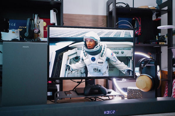 B8905同樣可以搭配電腦作為影音橋梁,同樣使用HDMI eARC作為連接方式連接電腦顯卡和顯示器,將系統(tǒng)音頻輸出選擇為Nvidia Output(或AMD Output),即可完成高清視頻信號(hào)和音頻信號(hào)的無損傳輸。在播放支持杜比立體聲的資源或者游戲時(shí),可以獲得一樣的原汁原味體驗(yàn),可以當(dāng)作電腦音箱使用,非常方便。