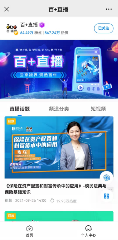 以百年人壽在微贊直播平臺(tái)上搭建的“百+直播”直播間為例,作為百年人壽聚焦直播生態(tài),打破客戶服務(wù)時(shí)空界限而打造的知識(shí)分享平臺(tái),通過邀請(qǐng)業(yè)內(nèi)專家大咖為客戶進(jìn)行線上授課,百+直播間目前已經(jīng)累計(jì)了超過64萬的平臺(tái)粉絲。