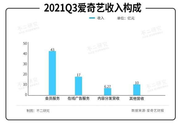 拆解愛奇藝收入構(gòu)成,會(huì)員服務(wù)、在線廣告、內(nèi)容分發(fā)、其他營收,在2021年三季度, 四大業(yè)務(wù)的營收占比分別為56.6%、22.4%、8.3%和13.2%。