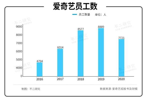 據(jù)愛奇藝招股書及財(cái)報(bào):2016-2020年末,愛奇藝的雇傭員工數(shù)分別為4794、6014、8577、8889、7721人。