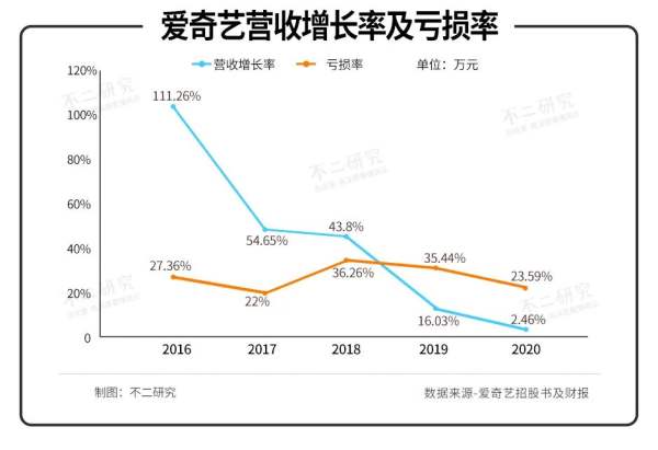不二研究」統(tǒng)計(jì)發(fā)現(xiàn),愛奇藝在六年間累積虧損高達(dá)300億元,凈利率均為負(fù)數(shù);2016-2020年,愛奇藝凈虧損率分別為27.36%、22%、36.26%、35.44%、23.59%。