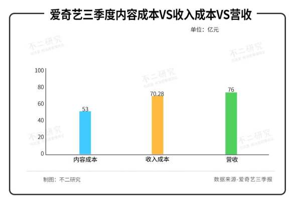 愛奇藝員工的相關(guān)工資、福利待遇的支出主要體現(xiàn)在研發(fā)費(fèi)用科目?!覆欢芯俊拱l(fā)現(xiàn),愛奇藝三季度的收入成本為70.28億元,其中的研發(fā)費(fèi)用為6.83億元,同比僅增長2%,在收入成本占比9.7%;而內(nèi)容成本高達(dá)53億元,在收入成本占比高達(dá)75.41%。