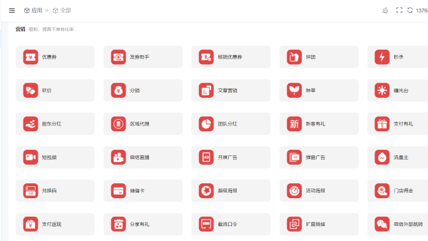 步驟三,那么我們?cè)谧鑫⑿判〕绦虻臅r(shí)候可以添加哪些小程序營(yíng)銷(xiāo)活動(dòng)呢,小程序營(yíng)銷(xiāo)活動(dòng)也是微信小程序的重要引流活動(dòng)之一,在飛多多中也是有非常多的模版,比如我們常見(jiàn)的拼團(tuán)活動(dòng)、砍價(jià)活動(dòng)、秒殺活動(dòng)、會(huì)員卡、優(yōu)惠券、積分商城和分銷(xiāo)商城小程序等。