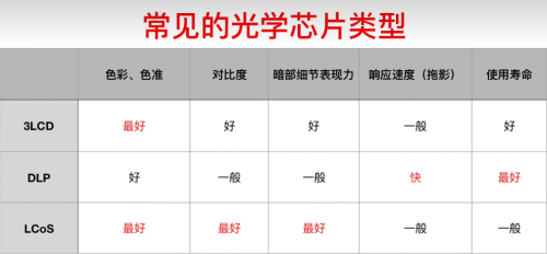 其中鏡頭,我們很好理解,代表著不同的焦段。而光閥也就是顯示芯片,目前對(duì)常見的有5種,LCD、3LCD、DLP、3DLP、LCoS。過(guò)多的專業(yè)解釋就不占篇幅了,直接說(shuō)結(jié)論。