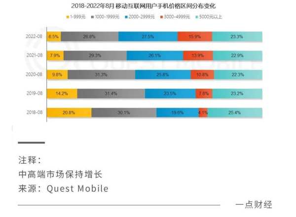 事實上,這也暗合著手機行業(yè)的發(fā)展趨勢。從Quest Mobile的數(shù)據(jù)中可以看出,2018年至2022年,移動互聯(lián)網手機2000-5000元價位段的銷售占比在持續(xù)上升,總占比從23.7%攀升至43.4%,2000元以下價位段的占比從50.9%下跌至33.3%。