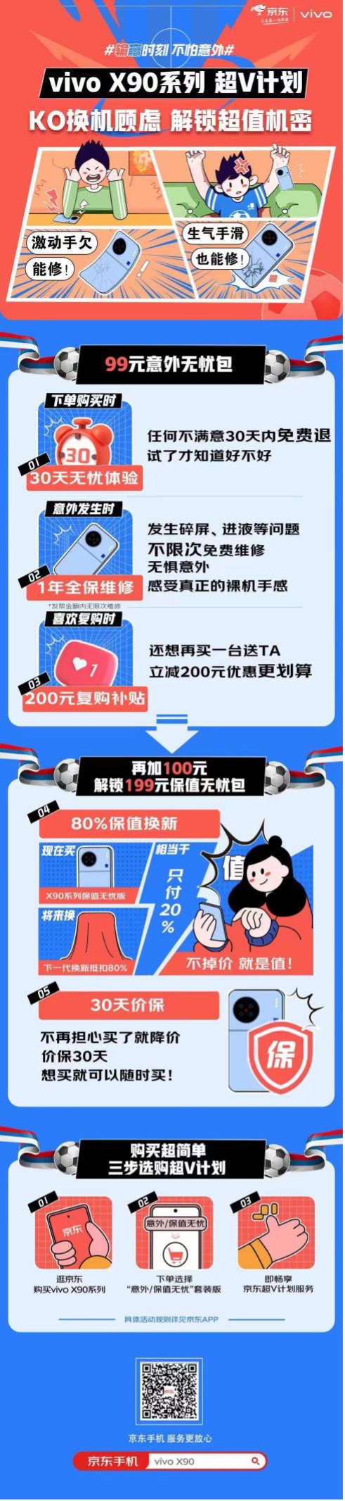 近年來,手機(jī)市場銷量銷額增速逐漸放緩,在消費(fèi)者越來越理性的趨勢下,手機(jī)廠商和零售商們在提升產(chǎn)品力的同時(shí),不得不將精力更多地放在服務(wù)和價(jià)格上。手機(jī)市場繼價(jià)格戰(zhàn)、渠道戰(zhàn)、產(chǎn)品戰(zhàn)后,進(jìn)入“產(chǎn)品+服務(wù)+價(jià)格”的綜合競爭時(shí)代。在此背景下,始終堅(jiān)持低價(jià)策略并對消費(fèi)者購機(jī)體驗(yàn)尤為重視的京東,聯(lián)合手機(jī)廠商展開更深層次的創(chuàng)新和探索。其中,京東與vivo針對vivo X90系列推出的超V計(jì)劃,根據(jù)用戶個(gè)性化的分層需求,分為兩個(gè)不同價(jià)格、各有側(cè)重的套裝,99元“意外無憂”套裝包含1年不限次全保維修、30天無憂體驗(yàn)和200元復(fù)購補(bǔ)貼;199元“保值無憂”套裝包含1年不限次全保維修、30天無憂體驗(yàn)、30天安心價(jià)保、200元復(fù)購補(bǔ)貼和80%保值換新。