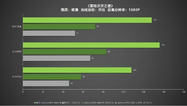 轉(zhuǎn)變?yōu)?K畫(huà)質(zhì)后,耕升 GeForce RTX 4060 Ti 追風(fēng) EX3的表現(xiàn)依舊亮眼,開(kāi)啟DLSS 3 質(zhì)量模式和 DLSS 3性能模式時(shí),游戲的幀率提升近120%,在優(yōu)越畫(huà)質(zhì)和極致流暢度下,玩家可以盡情的領(lǐng)略美好的魔法世界。而GeForce RTX 3060 Ti 和GeForce RTX 2060 SUPER則相對(duì)更加依賴(lài)DLSS技術(shù)一些,通過(guò)NVIDIA DLSS 性能模式,幀數(shù)分別可以達(dá)到70幀和60幀。