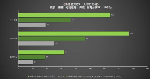 《消逝的光芒2:人與仁之戰(zhàn)》的DLSS適配較為優(yōu)秀,在1080P分辨率光追開(kāi)啟DLSS 性能模式下,GeForce RTX 3060 Ti 和GeForce RTX 2060 SUPER的幀率 93和50幀,比起未開(kāi)啟DLSS前提升幅度高達(dá)150%左右,同時(shí)耕升 GeForce RTX 4060 Ti 追風(fēng) EX3在開(kāi)啟 DLSS 3 性能模式后幀率一度來(lái)到了154幀,這個(gè)提升幅度可謂是令人震驚的,可見(jiàn) DLSS 技術(shù)對(duì)于次世代 游戲的體驗(yàn)優(yōu)化相當(dāng)重要。同時(shí)開(kāi)啟DLSS 質(zhì)量模式下,耕升 GeForce RTX 4060 Ti 追風(fēng) EX3的幀率也一度來(lái)到了128幀,相比未開(kāi)啟時(shí)既保證了流暢度的提升,同時(shí)畫(huà)質(zhì)也持于一個(gè)優(yōu)秀的水平。