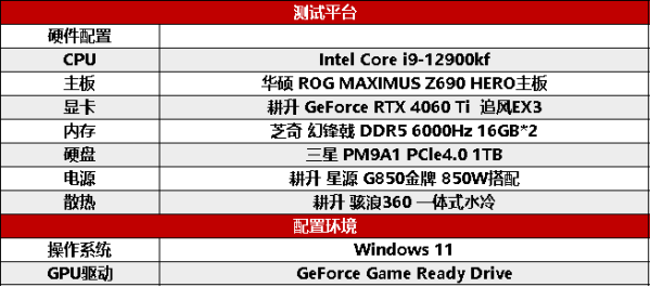本次測(cè)試環(huán)節(jié)使用了Intel Core i9-12900k,主板方面使用的使用ROG MAXIMUS Z690 HERO主板,內(nèi)存方面啟用2條芝奇 幻鋒戟 DDR5 6000Hz 16GB,電源采用的是 耕升 星源 G850金牌 850W,散熱方面則是 耕升 駭浪360 一體式水冷,這套配置可以為GPU提供大量降溫以及供電 ,驅(qū)動(dòng)則更新至剛剛發(fā)布的最新版本GeForce Game Ready Drive。這套配置完全足夠讓耕升 GeForce RTX 4060 Ti 追風(fēng) EX3在測(cè)試中擁有穩(wěn)定且強(qiáng)勁的發(fā)揮。
