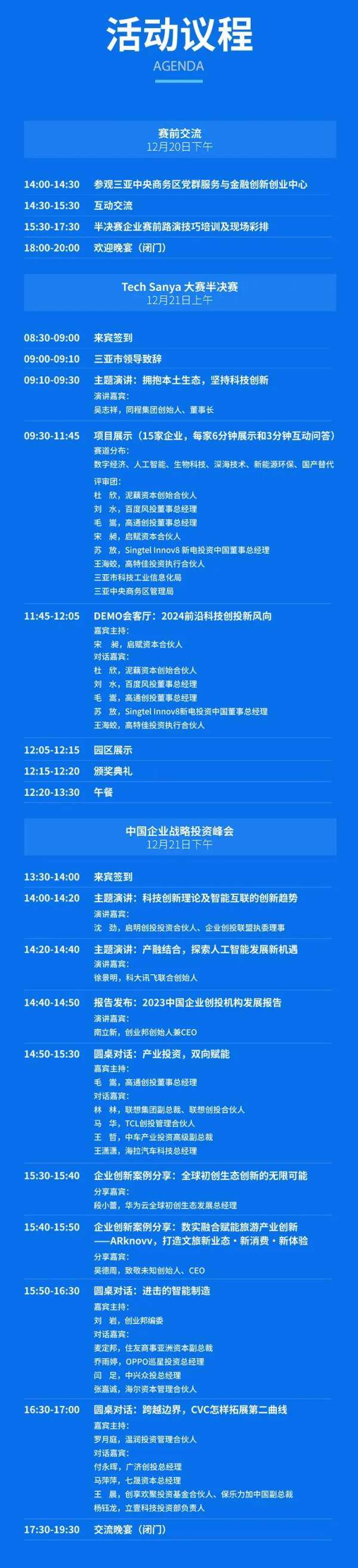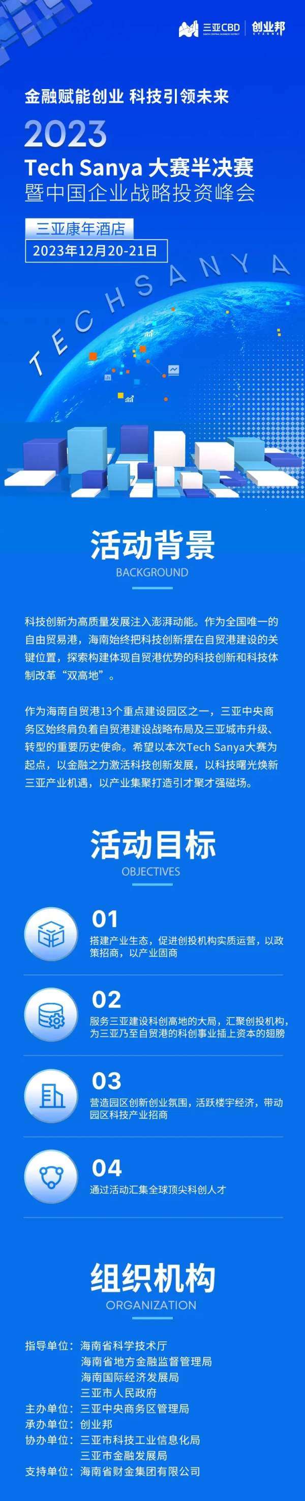 為進一步完善園區(qū)科技金融產(chǎn)業(yè)生態(tài),由三亞中央商務(wù)區(qū)管理局主辦,創(chuàng)業(yè)邦承辦,三亞市科技工業(yè)信息化局、三亞市金融發(fā)展局協(xié)辦的2023 Tech Sanya大賽半決賽暨中國企業(yè)戰(zhàn)略投資峰會,將于12月20日—21日在海南三亞舉辦。