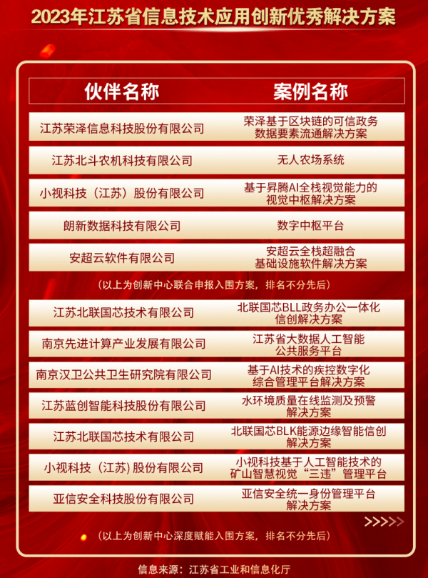 根據(jù)江蘇省工信廳公示的2023年度江蘇省信息技術(shù)應用創(chuàng)新優(yōu)秀解決方案入圍名單,江蘇鯤鵬·昇騰生態(tài)創(chuàng)新中心與江蘇榮澤科技、江蘇北斗、小視科技等5家生態(tài)伙伴聯(lián)合申報的解決方案入圍,江蘇北聯(lián)國芯、南京先進計算、亞信安全、江蘇藍創(chuàng)智能等17個深度賦能的解決方案入圍。