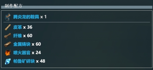 使用36個(gè)皮革、60個(gè)纖維、60個(gè)金屬鑄塊、24個(gè)噴火器管和48個(gè)帕魯?shù)V碎片制作一個(gè)騰炎龍鞍具。