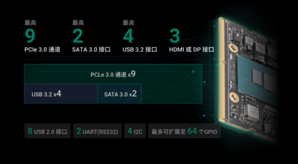 ③PCIe – 最多支持9條PCIe Gen3 通道,4個 UART 接口,4個I2C 接口,以及支持最多64個GPIO 接口