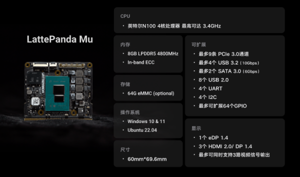 2024年4月18日,LattePanda(拿鐵熊貓)團隊在國內平臺正式發(fā)售LattePanda Mu,一款微型x86計算模塊,旨在迅速賦能定制設計解決方案。LattePanda Mu搭載英特爾N100 CPU,與Windows和Linux操作系統(tǒng)兼容。在CPU性能上優(yōu)于Raspberry Pi 5,在 GPU 性能上也強于多種傳統(tǒng)開發(fā)版的GPU。LattePanda Mu尺寸緊湊僅為60mm x 69.6mm,具有260引腳SO-DIMM邊緣連接器,默認配置8GB RAM和64GB eMMC閃存,其金手指有多種外設接口(如 PCIe、USB、HDMI),LattePanda Mu能夠無縫整合到各種應用中,包括物聯(lián)網(wǎng)、機器人、數(shù)字標牌和邊緣計算,確保在各種場景中高效處理任務和極強的可靠性。