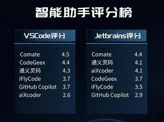 此外,在VSCode、Jetbrains等各大插件市場(chǎng)智能助手評(píng)分榜中,百度Comate分別以4.5和4.4位列第一,通義靈碼位居第二、第三, CodeGeeX、iFlyCode、aiXcoder、GitHub Copilot等跟隨其后。