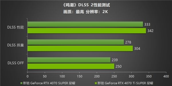 在最為主流的2K分辨率下,影馳 GeForce RTX 4070 SUPER 星曜和影馳 GeForce RTX 4070 Ti SUPER 星曜在《鳴潮》游戲?qū)崪y中表現(xiàn)也是毫不遜色。兩張顯卡在關(guān)閉DLSS的情況下幀數(shù)分別達到了239幀和250幀的優(yōu)異成績。開啟DLSS 2后,在DLSS 質(zhì)量模式下兩張顯卡的成績均擁有明顯的上升,在DLSS性能模式下,幀數(shù)更是均上漲了135%以上的優(yōu)異表現(xiàn),分別達到了333幀和342幀。NVIDIA DLSS技術(shù)的加持,讓玩家能夠享受在高畫質(zhì)下依舊高幀流暢的游戲體驗。