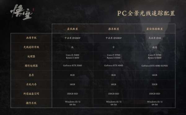 游戲科學(xué)在8月13日就已經(jīng)上線了《黑神話:悟空 性能測試工具》,相信很多小伙伴通過了九九八十一難中的第一難。當(dāng)然,畢竟是中國第一款真正意義3A的游戲大作,想要暢想西游行還是需要不俗的裝備。游戲科學(xué)《黑神話:悟空》早就在官網(wǎng)公布了PC版使用全景光線追蹤配置的要求。