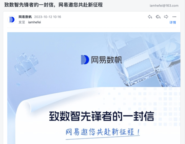 倘若把網(wǎng)易數(shù)帆比作“造船者”,扮演“舵手”角色的則是一家家“懂行”的企業(yè),一個個熟悉需求的開發(fā)愛好者。撰文|張賀飛編輯|沈菲菲作為網(wǎng)易郵箱的老用戶,10月12號在郵箱里收到了網(wǎng)易數(shù)帆的一封信,內(nèi)容是2023網(wǎng)易數(shù)字+大會的邀請函。不同往年的是,這次的邀請函從網(wǎng)易1997年收獲第一批郵箱用戶開始,細(xì)數(shù)