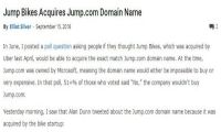 A5域名每日快訊:據(jù)外媒報(bào)道,一枚精品單詞域名Jump.com被海外終端收購。目前跳轉(zhuǎn)一個域名為Jumpbikes.com的網(wǎng)站。據(jù)悉,這是一家電動自行車共享公司,這家公司在今年4月份被出行巨頭Uber以大約2億美元的價格收購。