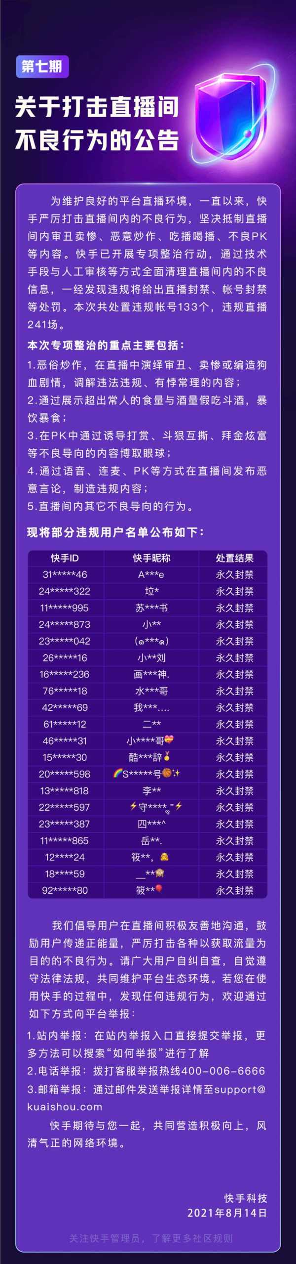 A5創(chuàng)業(yè)網(wǎng)(公眾號:iadmin5)8月16日報道,近日快手發(fā)布關(guān)于打擊直播間不良行為的公告(第七期),嚴(yán)厲打擊直播間內(nèi)的不良行為,堅決抵制直播間內(nèi)審丑賣慘、惡意炒作,吃播喝播,不良PK等內(nèi)容。