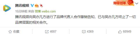 騰訊視頻微博稱:騰訊視頻向吳亦凡方進(jìn)行了品牌代言人合作撤銷告知,已與吳亦凡方終止了一切品牌層面的相關(guān)合作。