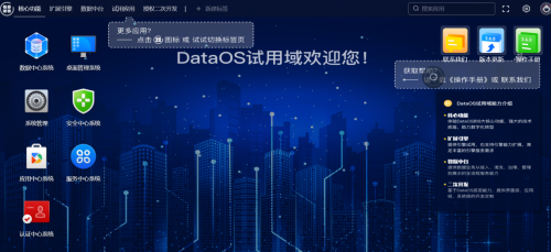 數(shù)據(jù)操作系統(tǒng)DataOS試用域是優(yōu)易數(shù)據(jù)為方便用戶(hù)直觀了解DataOS而打造的在線試用空間。DataOS試用域設(shè)置了“核心功能、擴(kuò)展引擎、數(shù)據(jù)中臺(tái)、試用應(yīng)用”等標(biāo)簽,并分別展示相應(yīng)的功能性應(yīng)用,方便大家在線操作