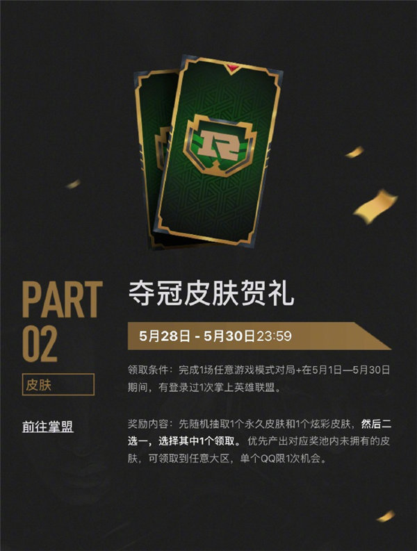 - A5創(chuàng)業(yè)網(wǎng)(公眾號(hào):iadmin5)5月25日?qǐng)?bào)道:RNG戰(zhàn)隊(duì)奪得MSI冠軍,《英雄聯(lián)盟》官方即將開(kāi)啟奪冠慶典八大活動(dòng)。奪冠皮膚賀禮不容玩家錯(cuò)過(guò)!玩家只要完成一場(chǎng)任意模式對(duì)局+在5月1日-5月30日期間登陸過(guò)一次掌盟。就能白嫖皮膚啦!完成上述領(lǐng)取條件后,可以隨機(jī)抽取一個(gè)永久皮膚和炫彩皮膚然后進(jìn)行二選