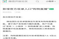 - 繼微信小商店正式開放內(nèi)測(cè)后,微信新增官方收錄入口“購物直播”,微信小商店購物直播功能正式接入微信公域流量!從微信小商店預(yù)熱到正式內(nèi)測(cè)開始,微信就一步一步的在為小商店直播帶貨做鋪墊,先是預(yù)告小程序可以分享到朋友圈,緊接著微信近期又發(fā)布,《新增官方收錄入口“購物直播”》公告,準(zhǔn)備灰度測(cè)試將小程序直播購物
