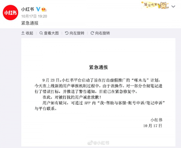 - 上周五,小紅書公布了“啄木鳥”計劃的首月成果。數(shù)據(jù)顯示,這項旨在打擊虛假推廣的治理行動,首月便對7383個賬號進行了斷流處罰,處罰筆記數(shù)量超過21.3萬篇。再早一周,小紅書卻因與此相關的事情被推上了微博熱搜。事件的導火索源自于小紅書上的多個創(chuàng)作者反映自己收到違規(guī)筆記的通知,一時之間,“小紅書打壓博主