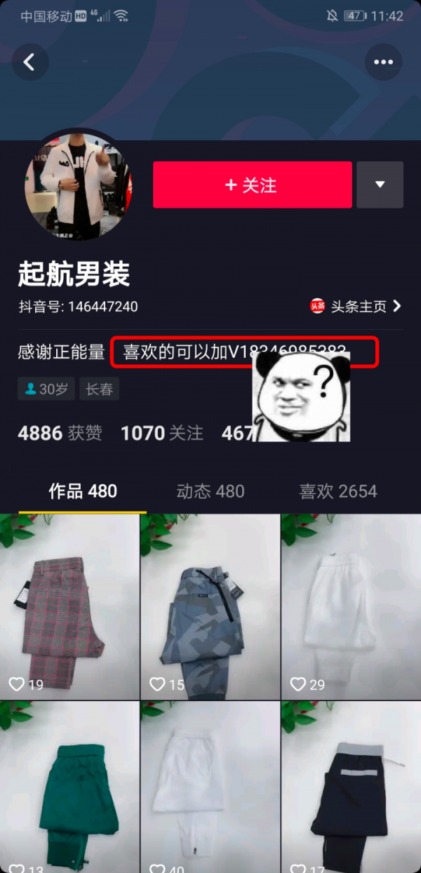 我找到了這兩天給客戶(hù)認(rèn)證通過(guò)的抖音號(hào),是一家做男裝的商家,他一次性認(rèn)證了4個(gè)抖音號(hào),現(xiàn)在漲粉已經(jīng)10萬(wàn)了。
