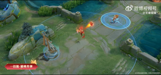 一技能: 沈夢(mèng)溪蓄力向目標(biāo)位置投擲龍燈形象炸彈,龍燈形象貓咪炸彈爆炸后產(chǎn)生紅色范圍火焰。