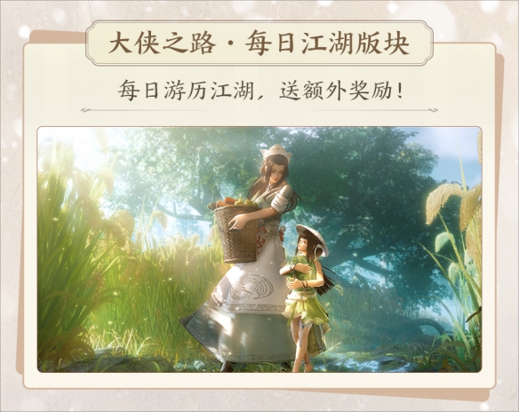 既得趣味又拿獎(jiǎng)勵(lì),關(guān)鍵還不費(fèi)時(shí),快來(lái)瞧一瞧!大俠之路新增“每日江湖”版塊驚喜滿(mǎn)滿(mǎn),只需花費(fèi)5-10分鐘,完成每日游歷江湖小任務(wù),即可累積江湖點(diǎn)數(shù)獲得額外獎(jiǎng)勵(lì)!